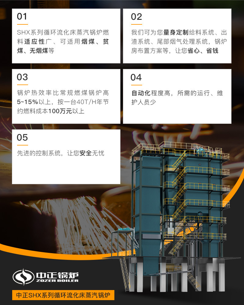 SHX系列循環流化床蒸汽鍋爐燃燒(CFBC)技術作為一種新型成熟的高效低污染清潔煤技術,具有許多其它燃燒方式沒有的優點。